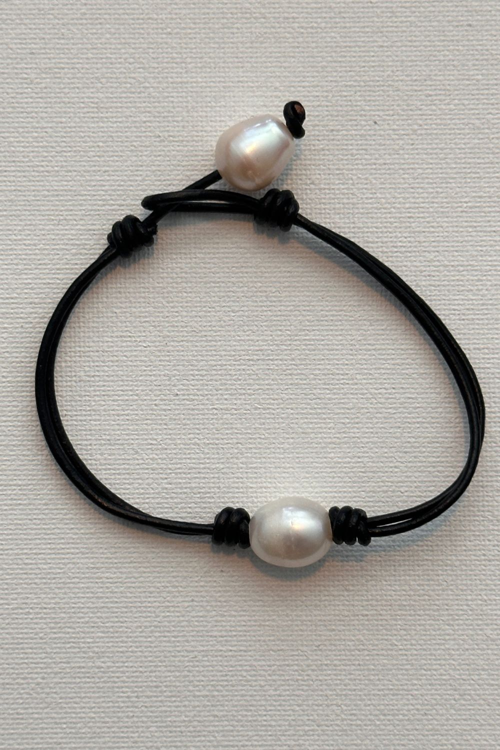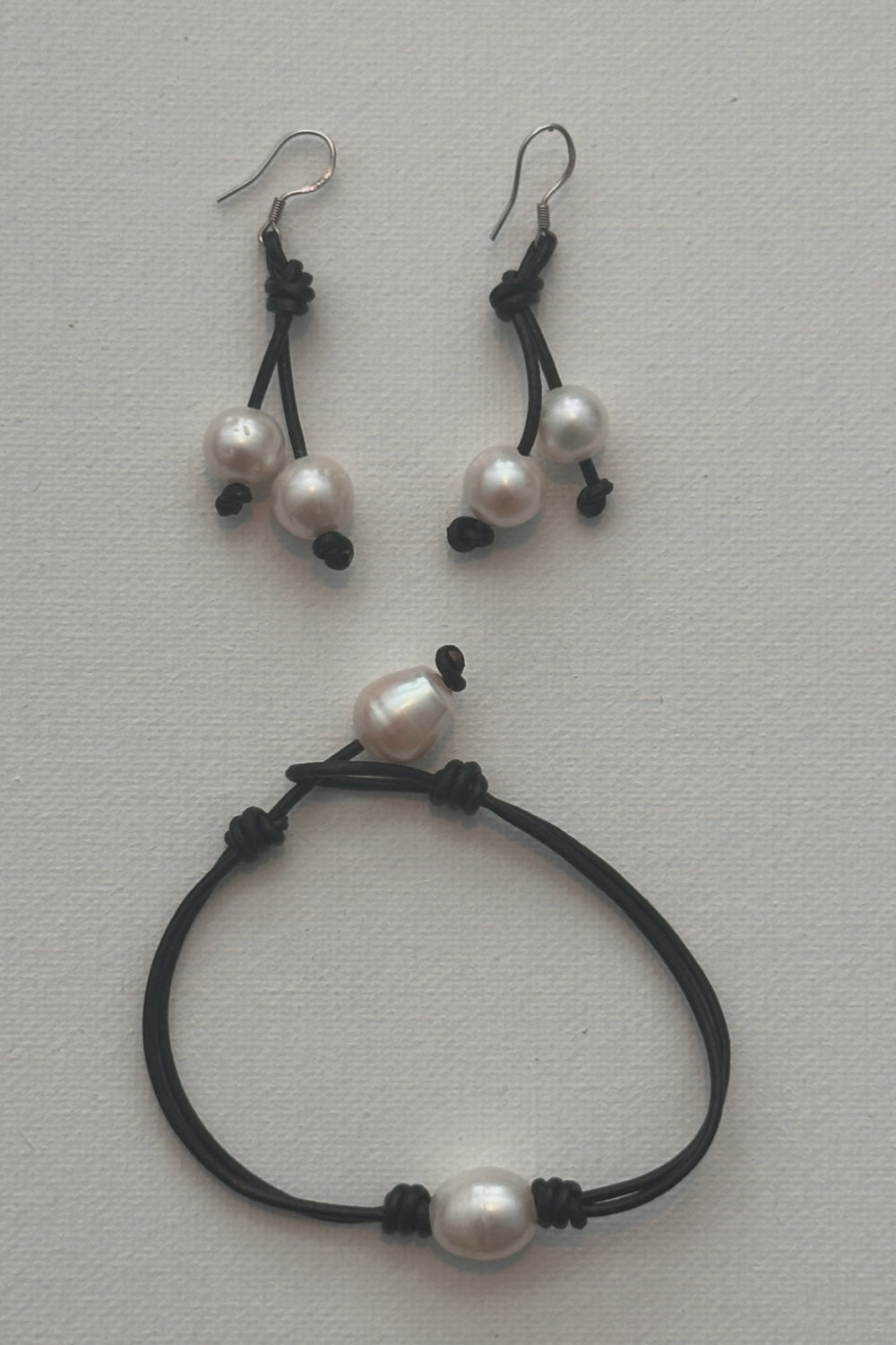 Enhance your elegance with this handcrafted jewelry set featuring a minimalist yet sophisticated design. The set includes a bracelet and a pair of drop earrings, each adorned with lustrous freshwater pearls that exude timeless beauty. The pearls are delicately set on durable black leather cords, creating a striking contrast that adds a modern twist to a classic look.