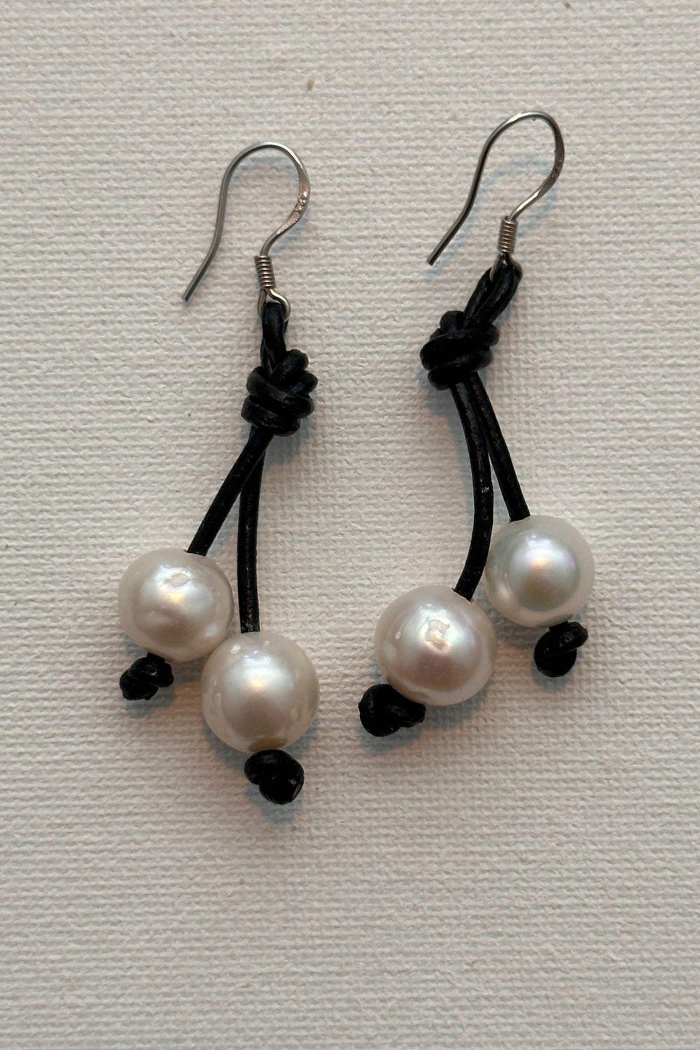 Freshwater Pearl Jewelry Set - Handcrafted Black Leather Cord Bracelet and Drop Earrings