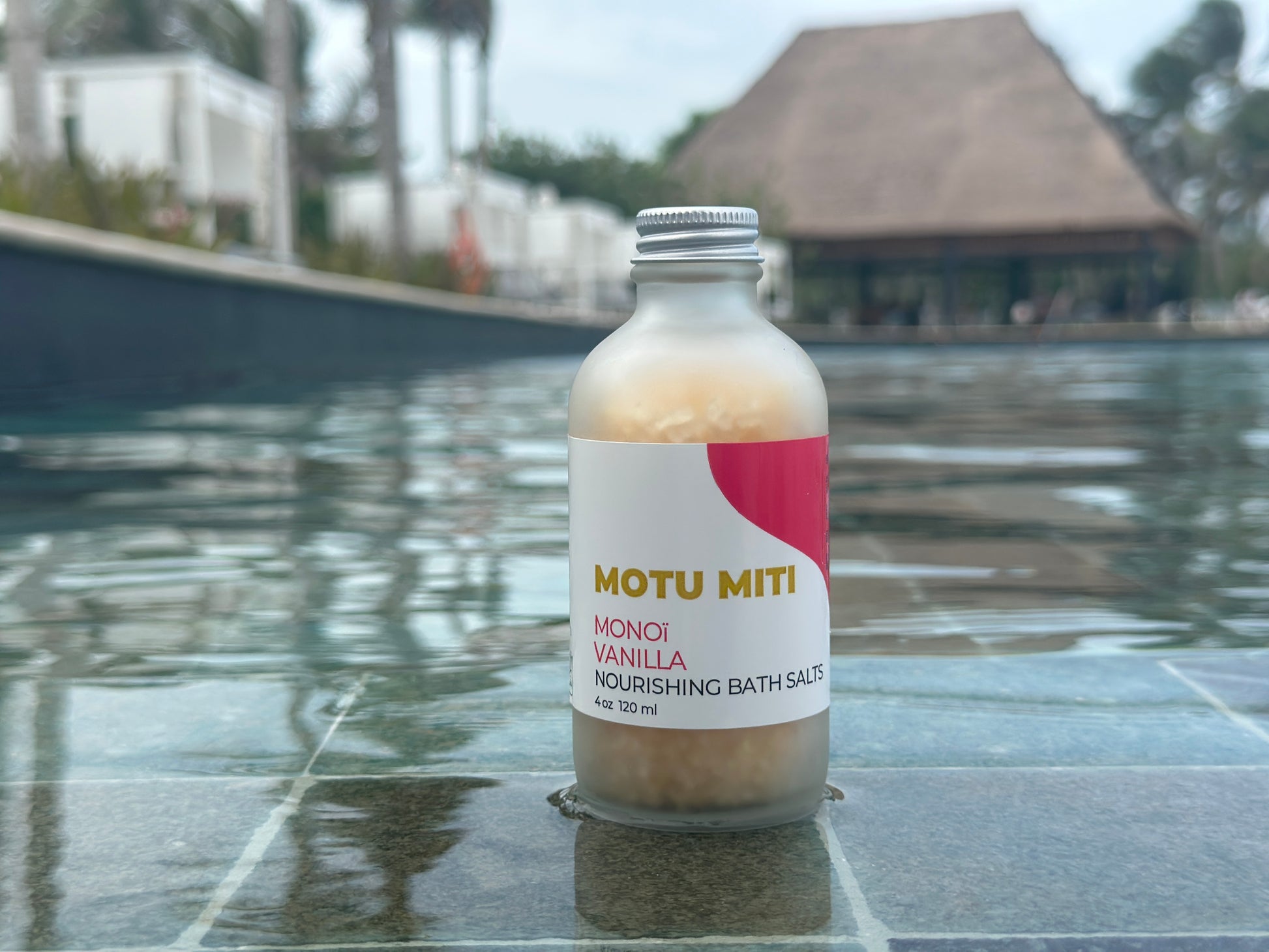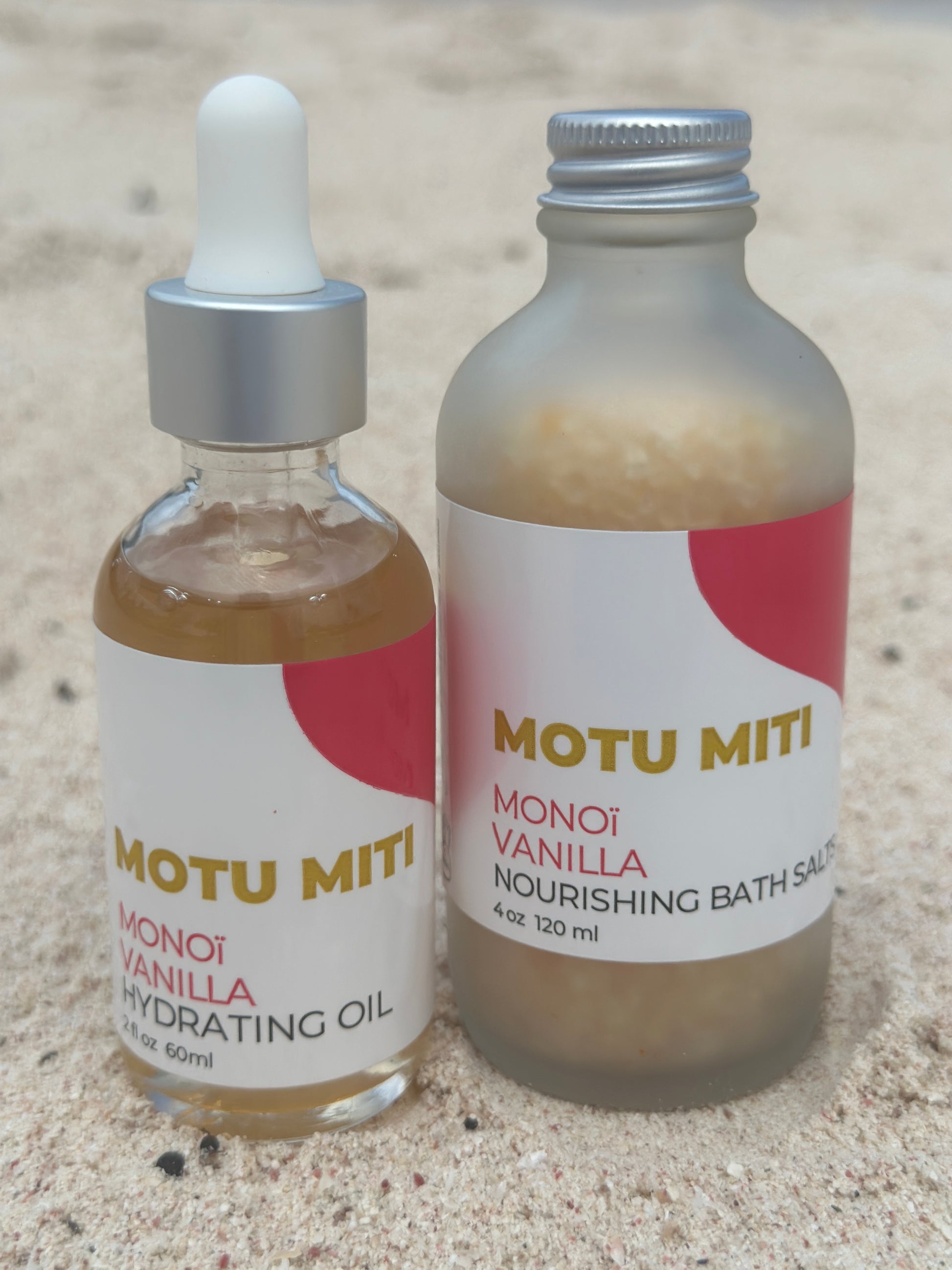 MOTU MITI MONOI OIL AND BALT SALT SET French Polynesian Monoi Oil. Body Oil, Bath Salt, Moisturizing Oil, Hydrating Oil, Bath Body and Shower, Skin Care. One- 2 fl oz Monoi Oil, One- 4 oz Bath Salt. ( Tiare Vanilla )